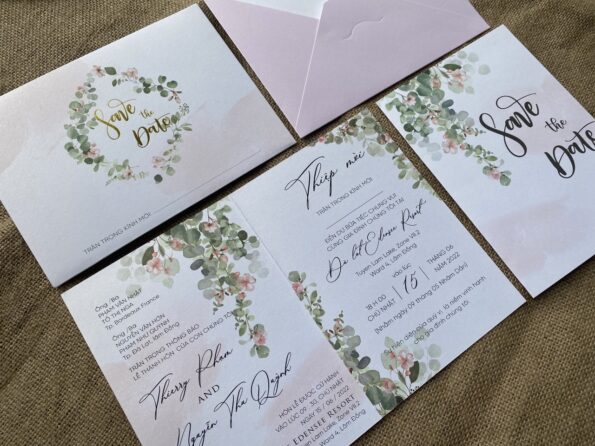 - Bộ thiệp bao gồm 1 bao thiệp, 2 tờ ruột in hai nội dung (thiệp mời & thiệp báo)