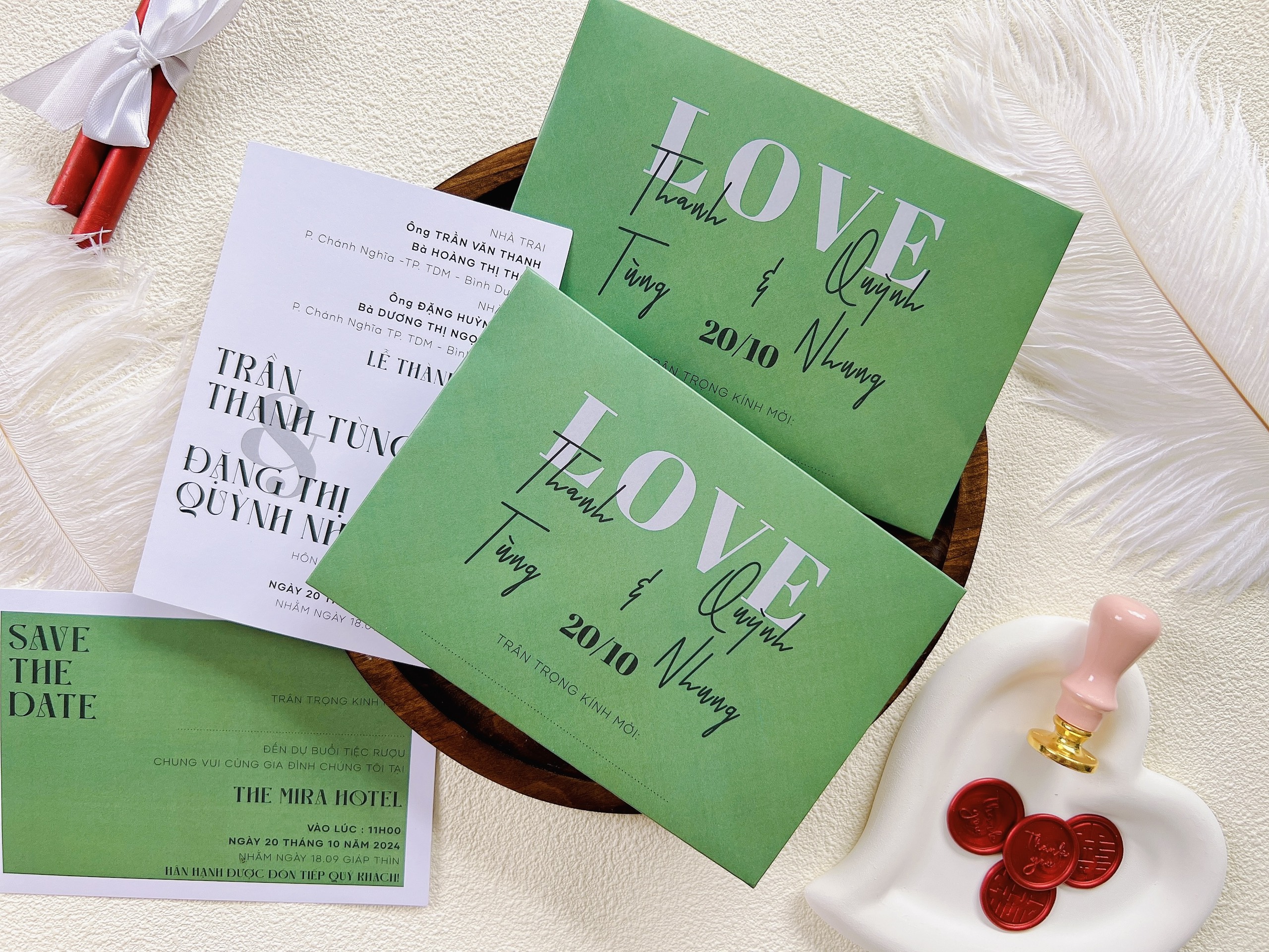 - Bộ thiệp bao gồm 1 bao thiệp, 2 tờ ruột in hai nội dung (thiệp mời & thiệp báo)