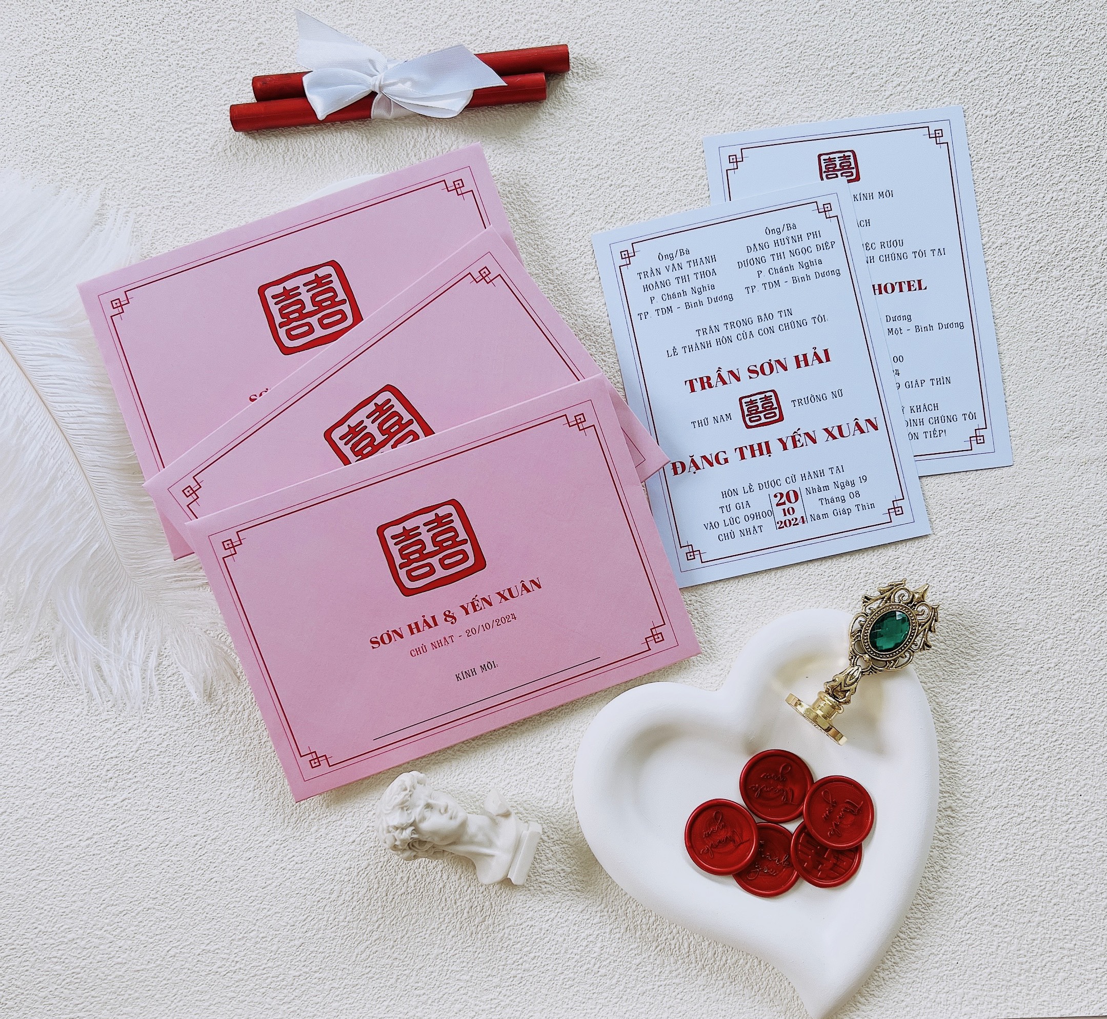 - Bộ thiệp bao gồm 1 bao thiệp, 2 tờ ruột in hai nội dung (thiệp mời & thiệp báo)